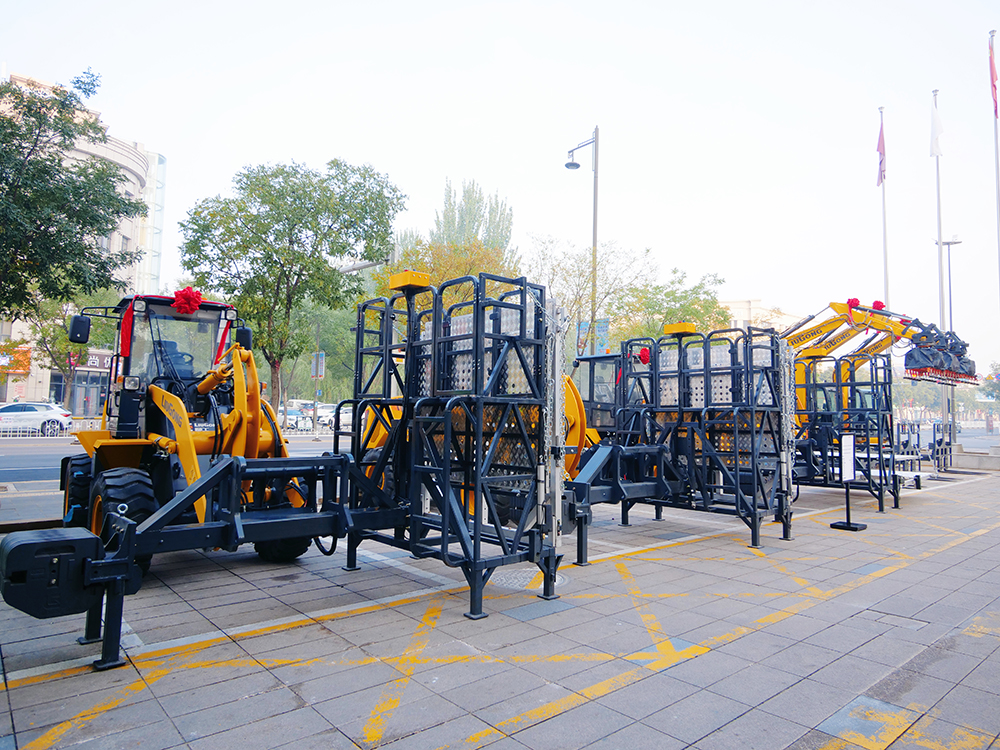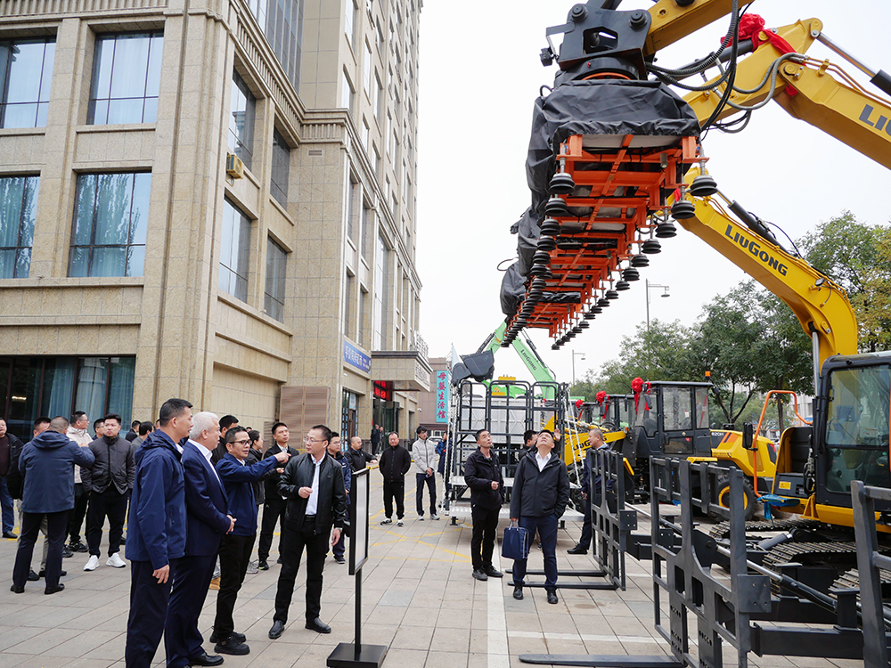 随后,嘉宾移步至展示区,近距离观摩该新型光伏安装成套设备。其中,908F光伏安装机的系列一键自动化安装动作控制、人机交互AI仪表、属具快换一机多能等产品亮点,引发与会代表的浓厚兴趣。