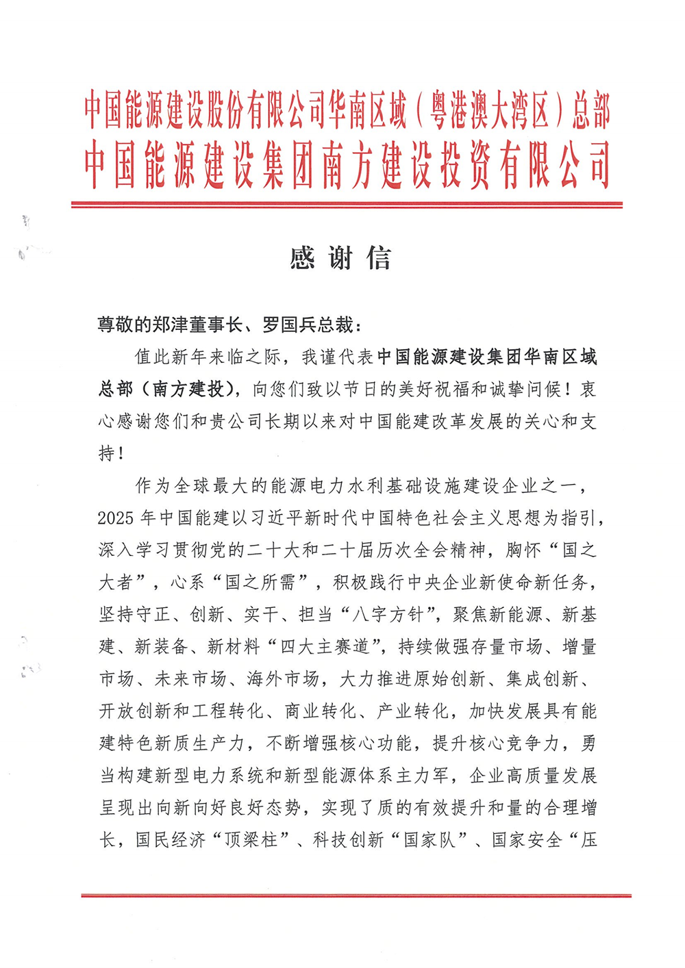 “真诚期待双方持续强化战略协同,不断拓宽合作领域……”1月21日,乐动网站收到一封沉甸甸的感谢信。这封感谢信来自中国能源建设集团华南区域总部(南方建投),字里行间满是双方并肩攻坚的深厚情谊,更印证了乐动网站作为“国之重器”助力重大项目建设的硬核底气。