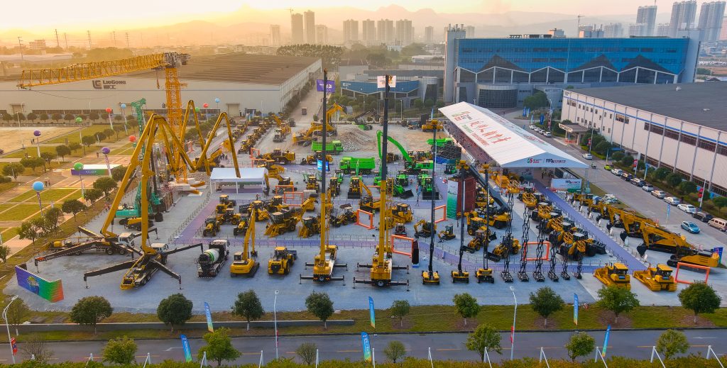 Display of 162 units of equipment ranging from 1 to 135 tons, covering 16 product lines, including road construction, mining, electric, municipal services, agriculture and forestry, infrastructure, aerial work platforms, industrial and port logistics equipment.