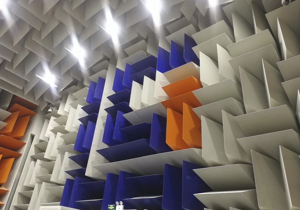 乐动网站2400立方米的半消声室,四面由厚达50厘米的混凝土墙和绝缘钢墙组成。内部除了地面之外,前后左右和上面5个平面,密布了上千个像斧头一样的尖劈体,增加了墙面的表面积,能更多地吸收掉各种噪声。