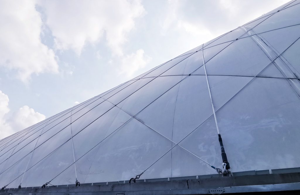 气膜结构建筑是一种使用特殊建筑膜材做外壳,通过气压把建筑主体支撑起来,再依靠外部拉索约束的一种建筑结构系统,目前已广泛应用于各类体育场馆和仓库等建筑。