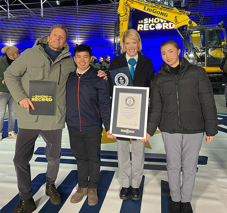 近日,在意大利电视台《Lo Show dei Record》节目中,朱飞操控乐动网站915FCR挖掘机,成功在1分钟摘掉模特头上的15顶帽子,打破了该项目此前1分钟摘下11顶帽子的吉尼斯世界纪录