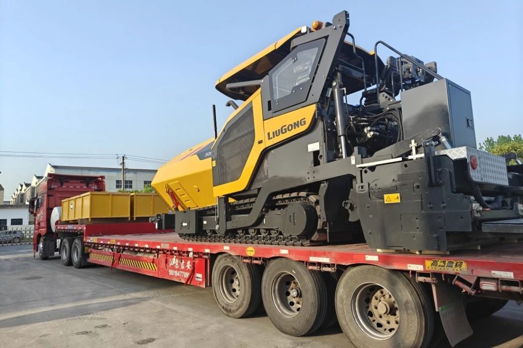 清晨,装车师傅们熟练驾驶摊铺机和铣刨机,稳稳驶上运输车。待最后一根固定绳索系牢,这些“钢铁战士”搭载货车,缓缓驶出厂区,奔赴中亚。