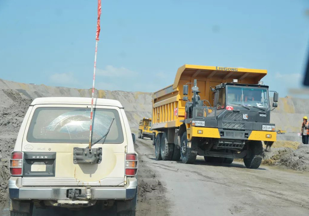 我们跟着工头的交通用车下到矿区,鲜艳的红旗在车尾高高飘起,双车道会车处设限高限宽装置,限速标识提醒司机控制车速,多辆洒水车在道路间往返穿梭。